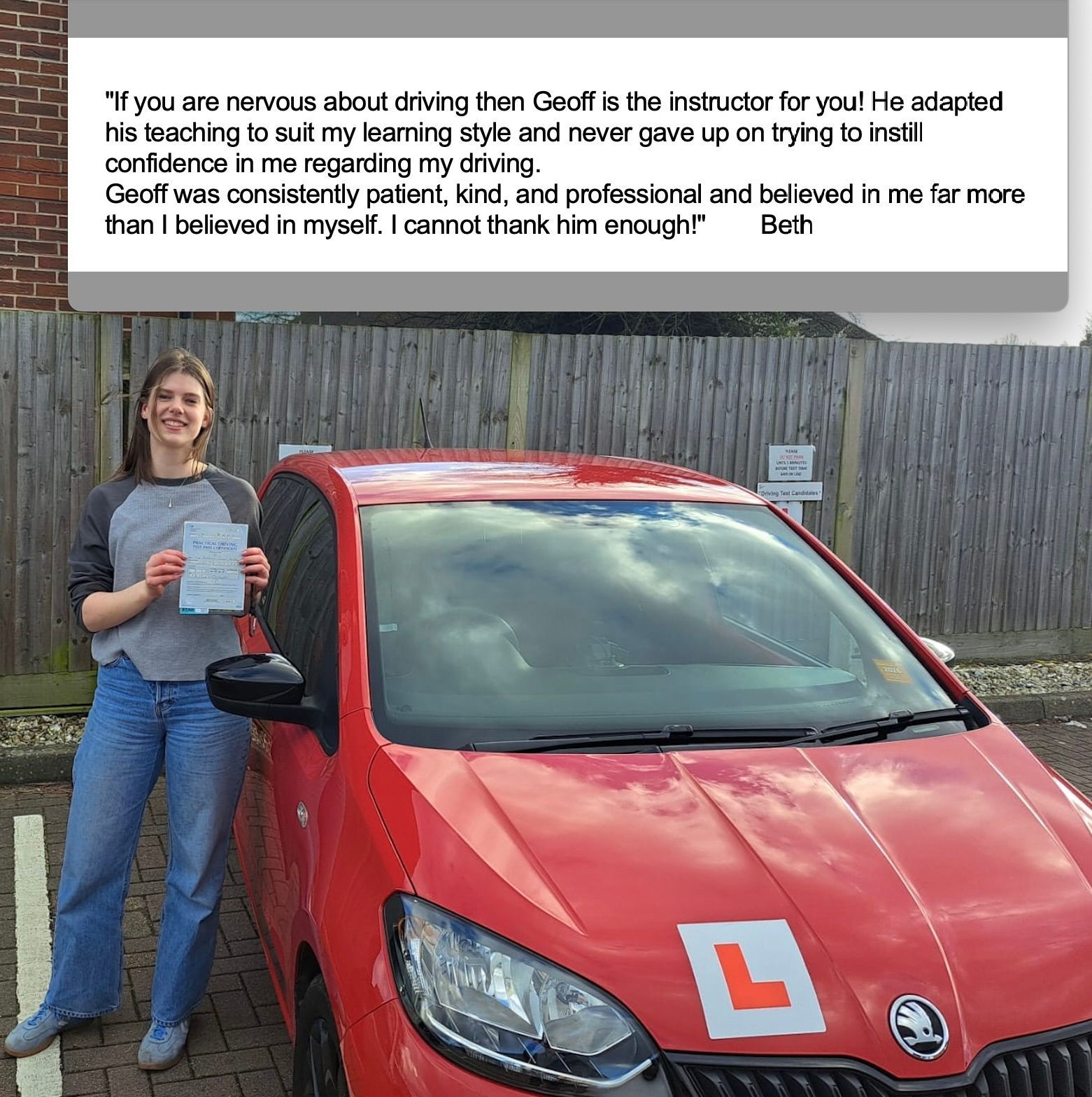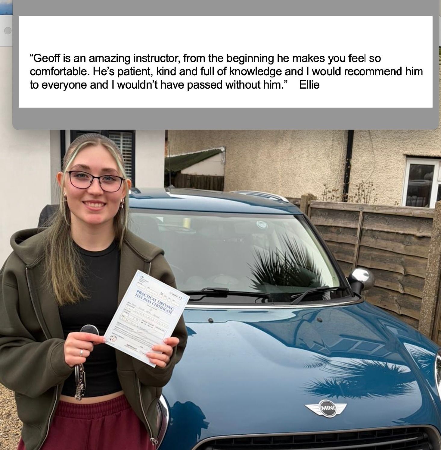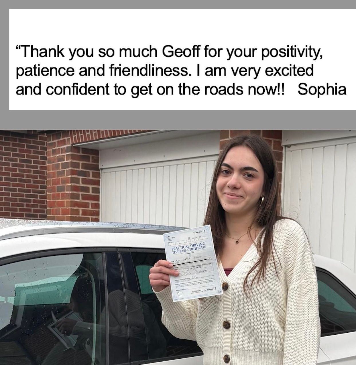 “Driving has always been a bit of an ordeal for me and I was super nervous before my test. Geoff was amazing at putting me at ease and very fair. Thank you Geoff!"